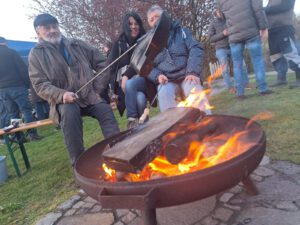 Zum Auftakt des Osterfeuers schien es, als wäre der Wettergott den Kleingärtnern nicht gnädig: am Ostersonntag „maimelte“ es gegen 18 Uhr noch kräftig. Die Organisatoren stellten vorsorglich einen Pavillon auf, um die Bratwürste im Trockenen grillen zu können. Doch schon wenig später klarte es auf, in der Feuerschale brannte das Holz – und mehr als 30 Gartenfreunde trafen sich, um einen angenehmen Abend am Lagerfeuer miteinander zu verbringen, am Feuer Stockbrot zu backen oder – siehe Foto – aus Jux ihre Schuhe vorzuwärmen, um keine kalten Füße zu bekommen.